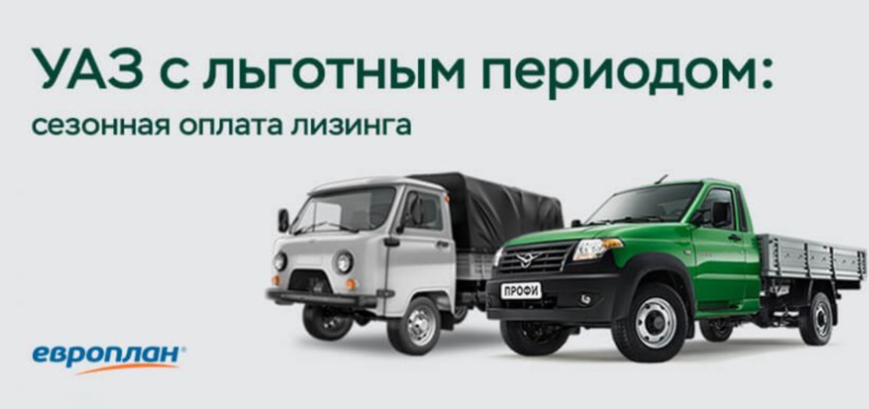 ООО «УАЗ» совместно с лизинговой компанией АО «ЛК Европлан». представляют новую эффективную программу лизинга для предпринимателей, в которой учтены сезонные особенности бизнеса. Вносите стандартные лизинговые платежи в высокий сезон, когда автомобиль больше всего работает, и оплачивайте лизинг на льготных условиях в низкий сезон при спаде деловой активности!