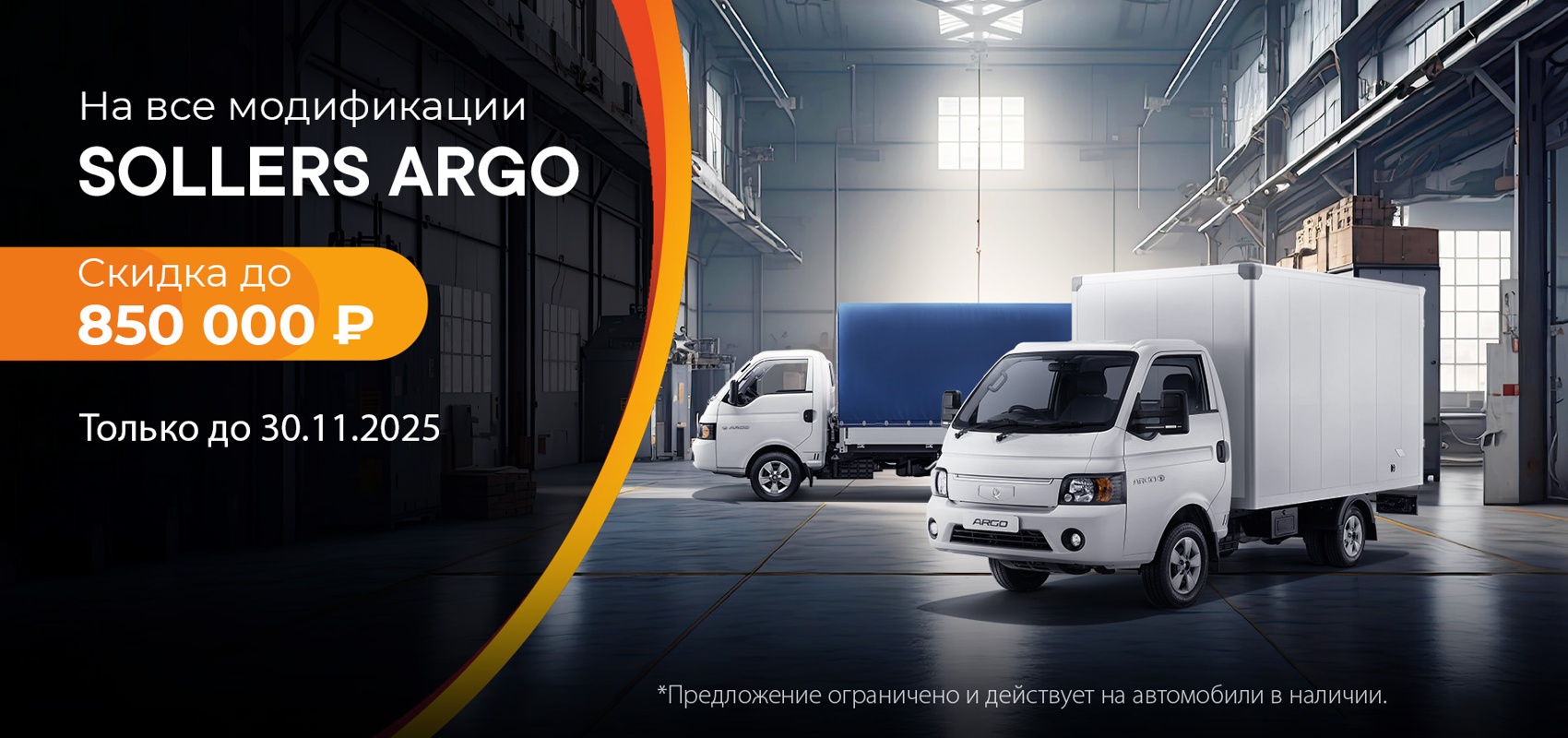 На все модификации SOLLERS ARGO скидка до 850 000 руб*. Предложение ограничено и действует на автомобили в наличии. Только до 30.11.2025 г.